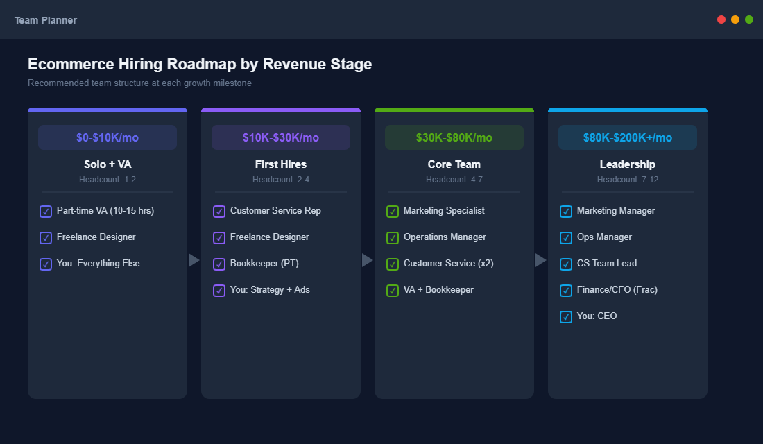 $0 – $10K/month (Solo Operator): You’re still wearing every hat, and that’s fine. But you should be documenting everything you do as you do it. Record Loom videos of your processes. Write quick SOPs in Google Docs. The brands that struggle to hire later are the ones who never wrote anything down during this phase. Your first “hire” at this stage should be a part-time virtual assistant handling order processing, basic customer emails, and social media scheduling — roughly 10-15 hours per week.