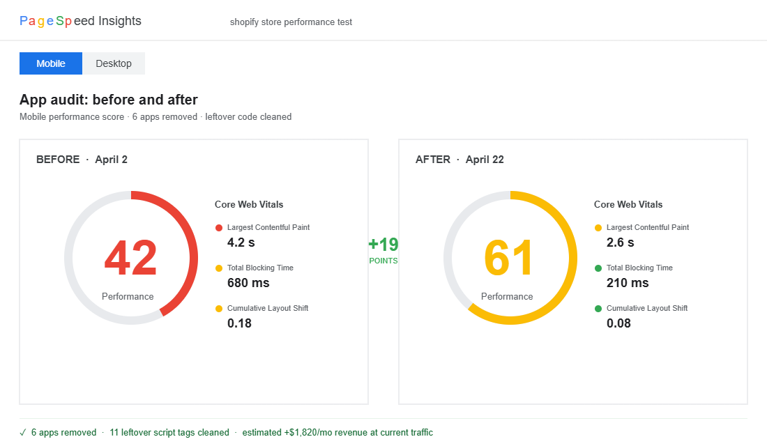 Then after each app removal, run it again. Most stores I audit show a 5–15 point mobile speed score improvement just from removing 4–6 redundant apps. That’s huge — and it’s measurable.