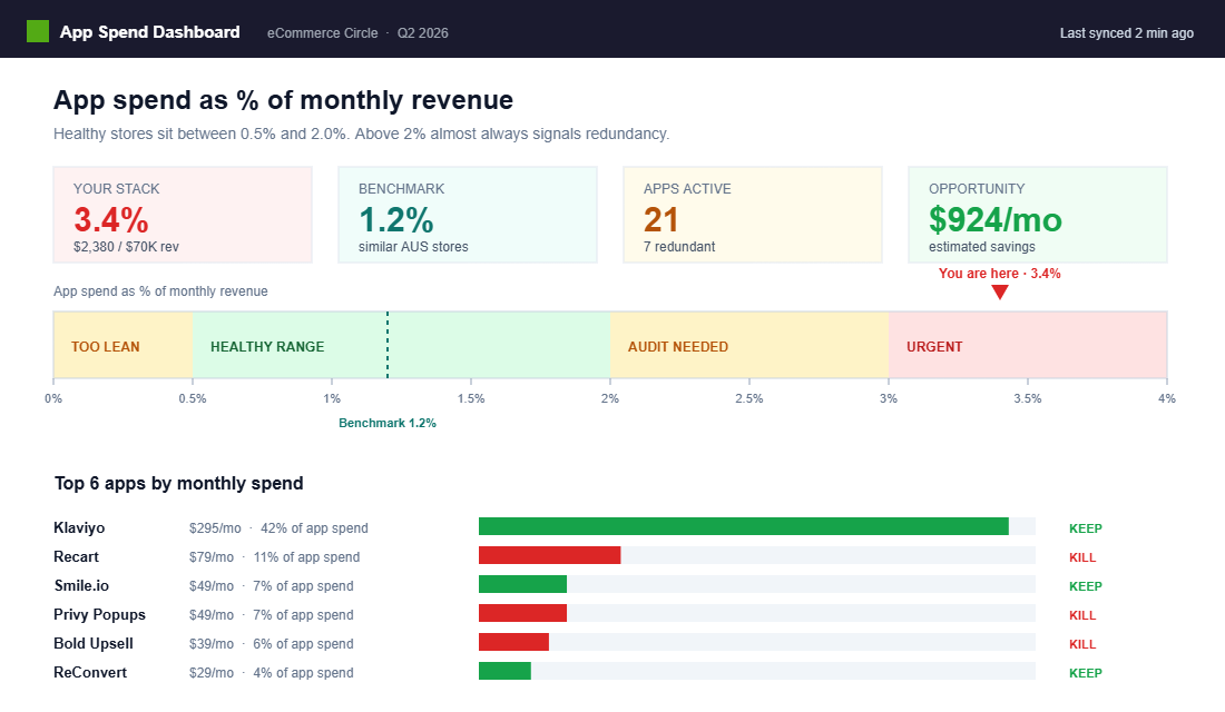 App spending should sit between 0.5% and 2% of your monthly revenue. Below 0.5% usually means you’re leaving revenue on the table (no email platform, no reviews, no analytics). Above 2% almost always means you have redundancy and bloat. Right in the middle — around 1–1.5% — is where the healthy, scaling stores live.