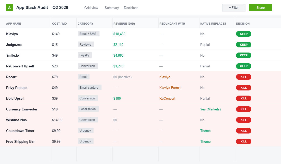 Add one row per app. The apps that can’t fill in “Last 90-Day Revenue Attributed” are almost certainly not paying for themselves. The apps with “Redundant With” filled in are the easiest wins.